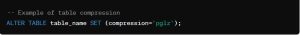 Compressing data and archiving historical records can help optimize storage usage and improve query performance by reducing disk I/O operations. Implement table compression and utilize tools like pg_dump for efficient backup and restore operations.