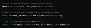 Optimizing SQL queries is critical for improving database performance. By analyzing query execution plans and identifying areas for optimization, developers can enhance query efficiency and reduce resource consumption. Here are some query optimization techniques:
