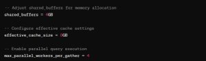 Fine-tuning database configuration parameters can significantly impact EDB Postgres performance. By adjusting settings related to memory allocation, disk storage, and parallelism, administrators can optimize resource utilization and throughput. For example: