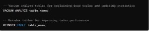Performing routine database maintenance tasks is crucial for ensuring optimal performance and preventing issues such as index bloat and table fragmentation. By scheduling regular vacuuming, reindexing, and statistics updates, administrators can keep the database in peak condition.